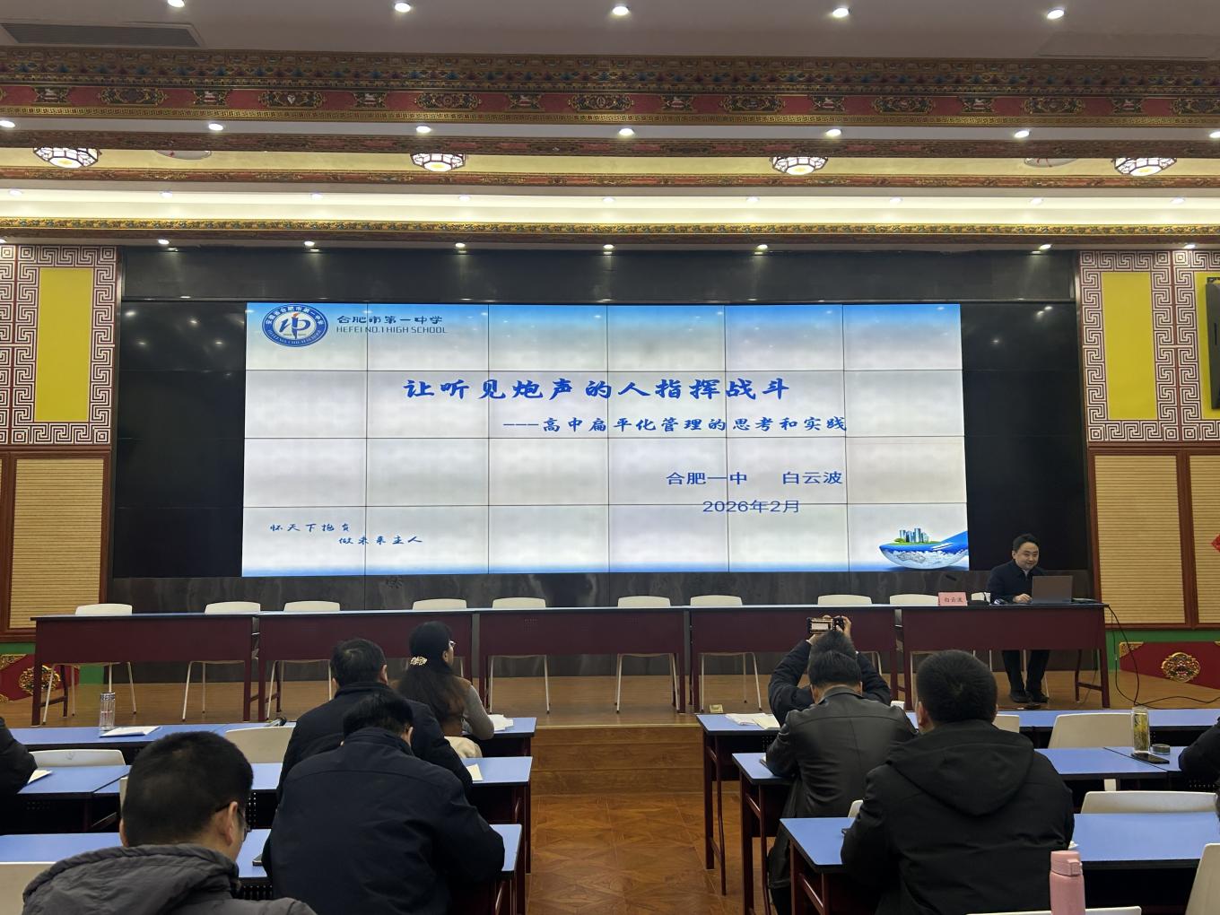 在热烈的掌声中,合肥一中高三年级部主任白玉波首先带来题为《让听见炮声的人指挥战斗——高中扁平化管理的思考和实践》分享。他从“扁平化管理”的核心内涵入手,深刻剖析了传统科层制管理在高中教育中的弊端,提出“让最了解学情、教情的人拥有更多决策权”的管理理念。白玉波主任结合一中高三年级的管理实践,详细介绍了年级部在学校授权下自主开展教学安排、教师调配、学生评价等方面的创新举措,生动诠释了“听见炮声的人指挥战斗”的实践路径。他的讲座视角新颖、观点鲜明,引发了在场管理干部的深度思考和热烈讨论。