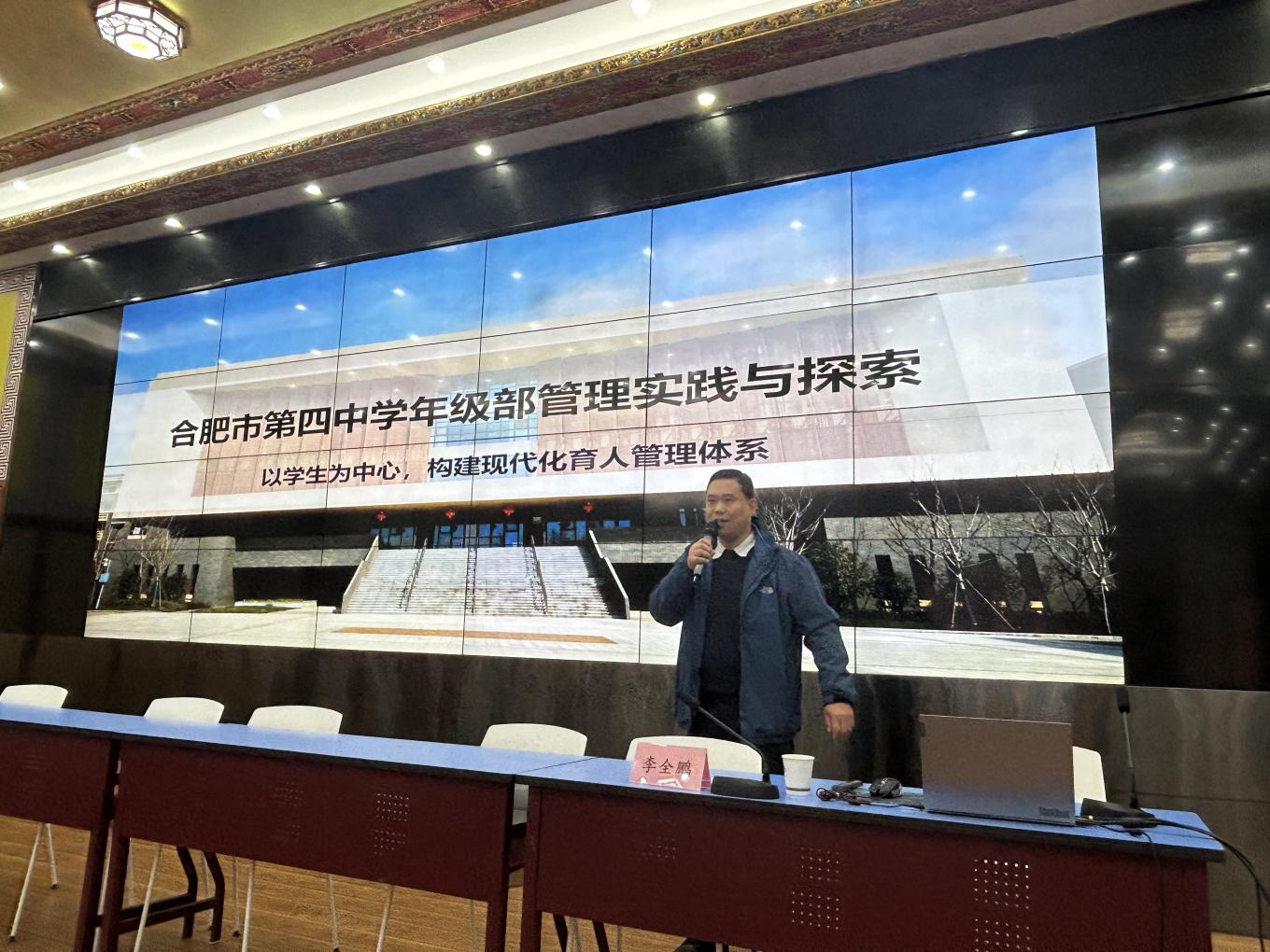 随后,合肥四中高二年级部主任李全鹏以《合肥市第四中学年级部管理实践与探索》为题作专题讲座。他结合四中年级部运行的实际案例,系统介绍了年级部在制度建设、团队协作、学生管理等方面的探索历程与实践成果,重点阐释了如何通过精细化管理提升年级运行效率,如何激发教师团队内生动力,如何构建家校协同育人机制。李主任的分享内容扎实、案例鲜活,既有理论高度,又有实践温度,为与会人员提供了可借鉴、可复制的管理范式。